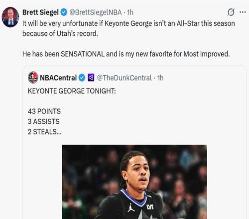 面对乔治这样的表现,名记Brett Siegel不禁感叹:“如果乔治因为战绩影响没能入选全明星那真的让人感到遗憾,本赛季他交出惊艳表现,是我心中进步最快球员人选。”